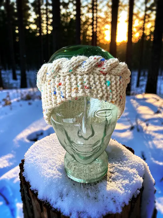 If you want something a little fancier, I have the same basic headband but with a cable top edging. It can add a bit of a crown-like feature if you are anything but basic. It still has a fairly flat profile so can be worn under other hoods if necessary.